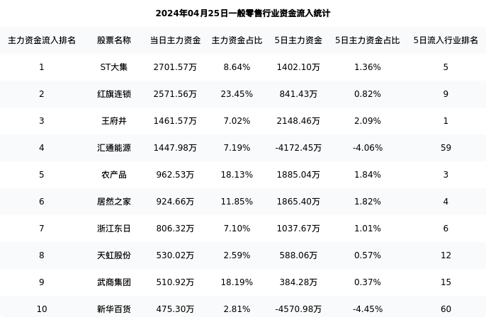 从主力资金流向来看,一般零售行业今日主力资金流入10.09亿元,在所有申万二级行业中排名:88/131。