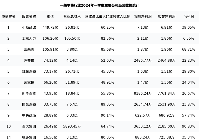 德必集团最新报告期数据为一季度,下表汇总了一般零售行业内市值靠前的公司一季度主要经营数据