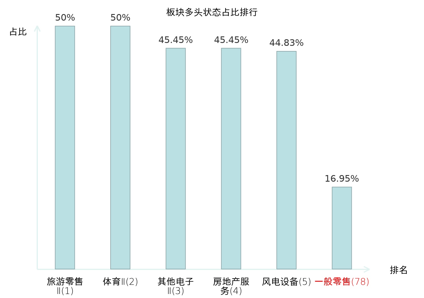 全市场所有行业板块中主力多头状态占比排名中,旅游零售Ⅱ板块位居第一。其他家电Ⅱ板块名次提升最快,较昨日上升112位。