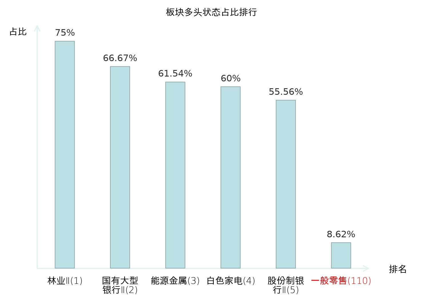 全市场所有行业板块中主力多头状态占比排名中,林业Ⅱ板块位居第一。数字媒体板块名次提升最快,较昨日上升48位。
