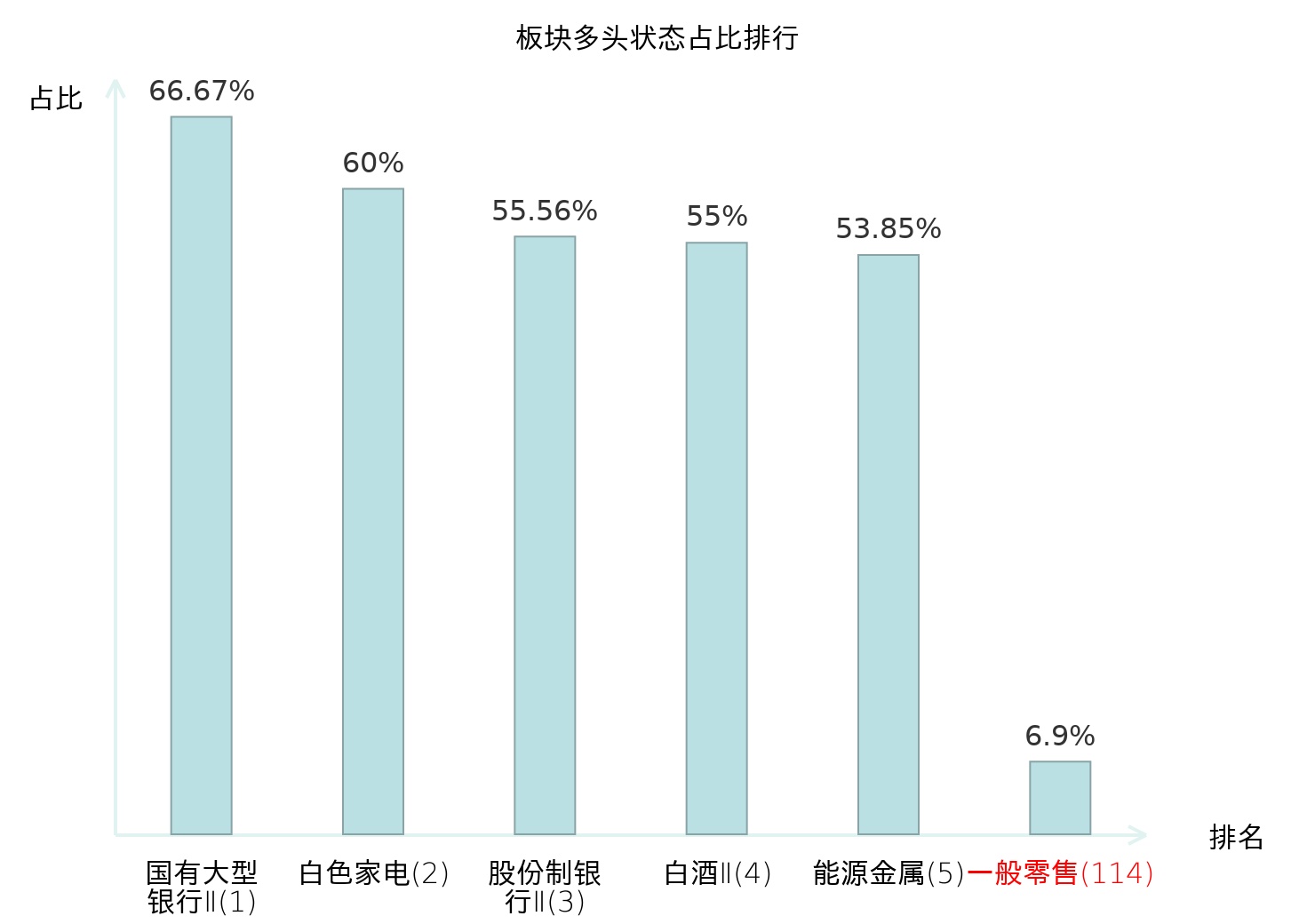 全市场所有行业板块中主力多头状态占比排名中,国有大型银行Ⅱ板块位居第一。林业Ⅱ板块名次提升最快,较昨日上升99位。