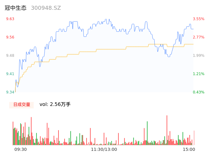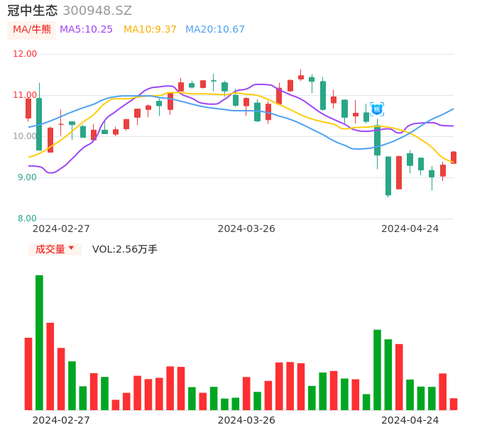 04月24日,冠中生态收报9.62,股价涨幅3.44%,成交金额2441.76万元,换手率1.96%。