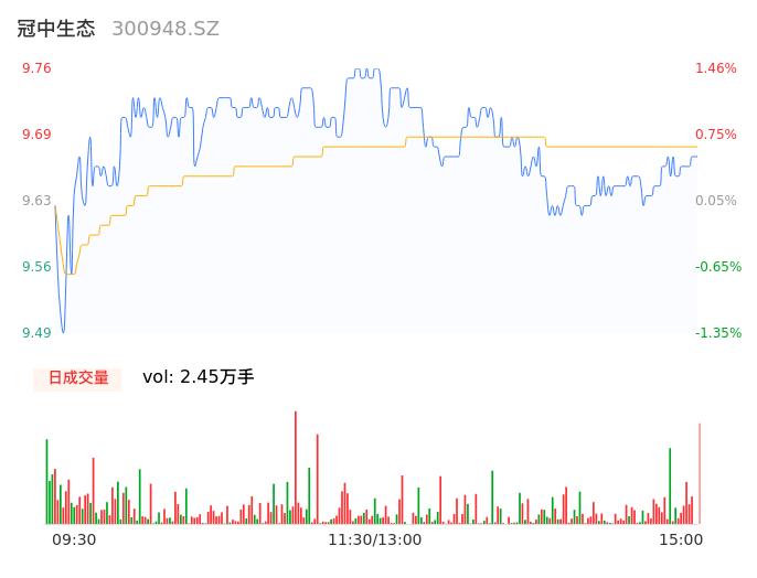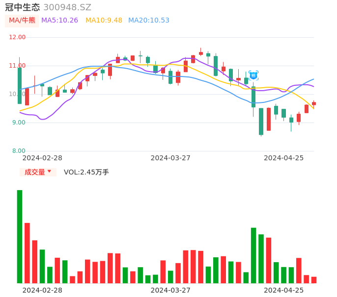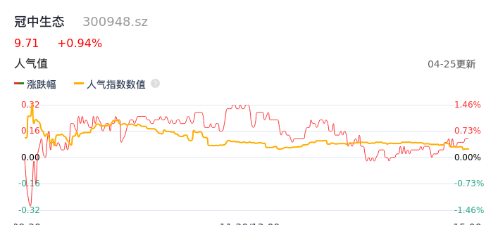04月25日,冠中生态收报9.71,股价涨幅0.94%,成交金额2368.63万元,换手率1.87%。