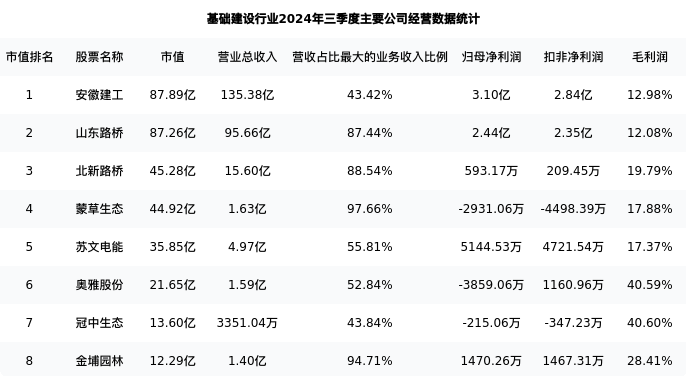 冠中生态最新报告期数据为三季度,下表汇总了基础建设行业内市值靠前的公司三季度主要经营数据