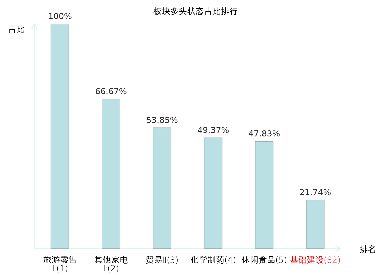 全市场所有行业板块中主力多头状态占比排名中,旅游零售Ⅱ板块位居第一。互联网电商板块名次提升最快,较昨日上升55位。