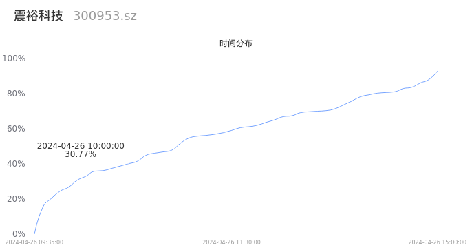 根据成交分布分析,该股票当天放量成交,成交清淡。时间上看,早盘前半小时成交量占据当天总成交量的30.77%;价格上看,成交呈现中间峰。成交分布分析主要研究股票成交的分布特性,不具有预测功能,请知悉。