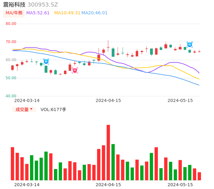 震裕科技近期出现日线级别熊点,且60分钟级别也处于熊点区间,股价处于偏弱行情,建议谨慎观望。