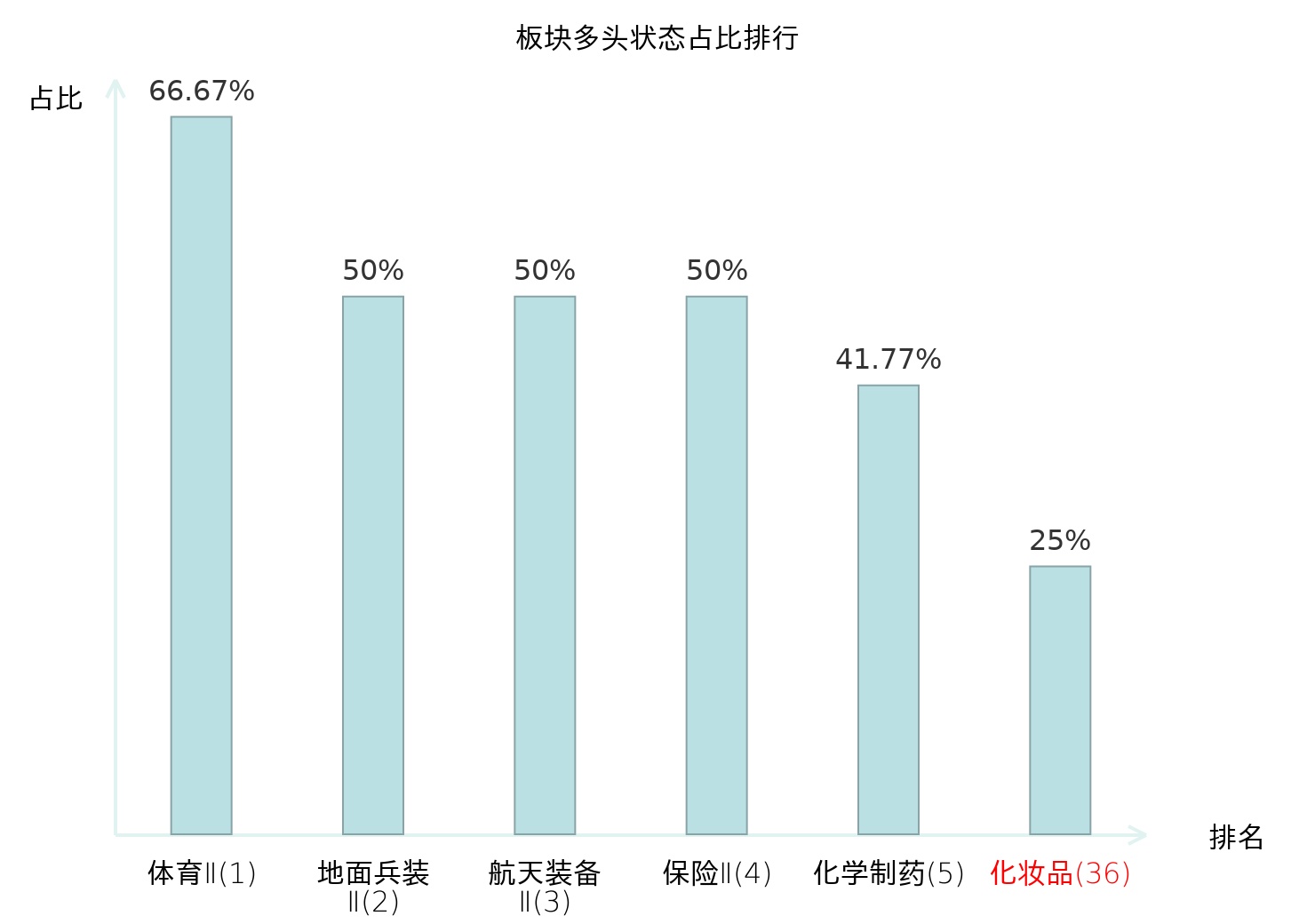 全市场所有行业板块中主力多头状态占比排名中,体育Ⅱ板块位居第一。普钢板块名次提升最快,较昨日上升98位。