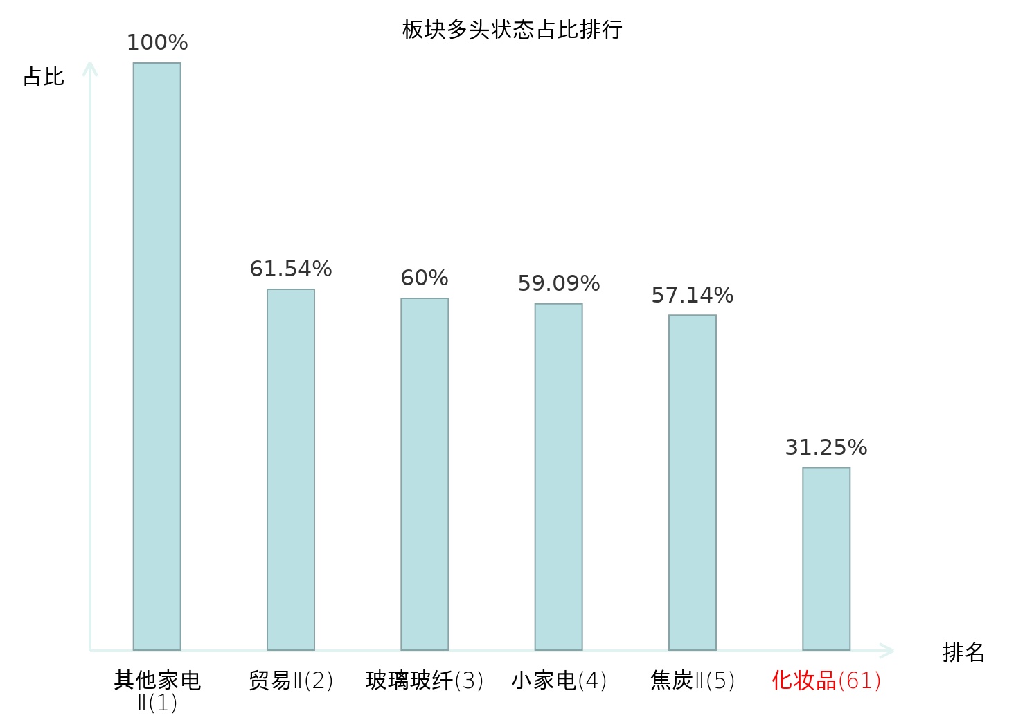 全市场所有行业板块中主力多头状态占比排名中,其他家电Ⅱ板块位居第一。摩托车及其他板块名次提升最快,较昨日上升76位。