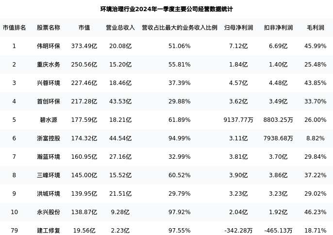 建工修复最新报告期数据为一季度,下表汇总了环境治理行业内市值靠前的公司一季度主要经营数据