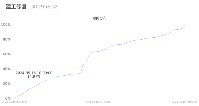 300958建工修复2024年05月16日成交6.31万手,成交金额8135.33万元,相较昨日放量3.09万手,换手率6.93%,成交清淡。