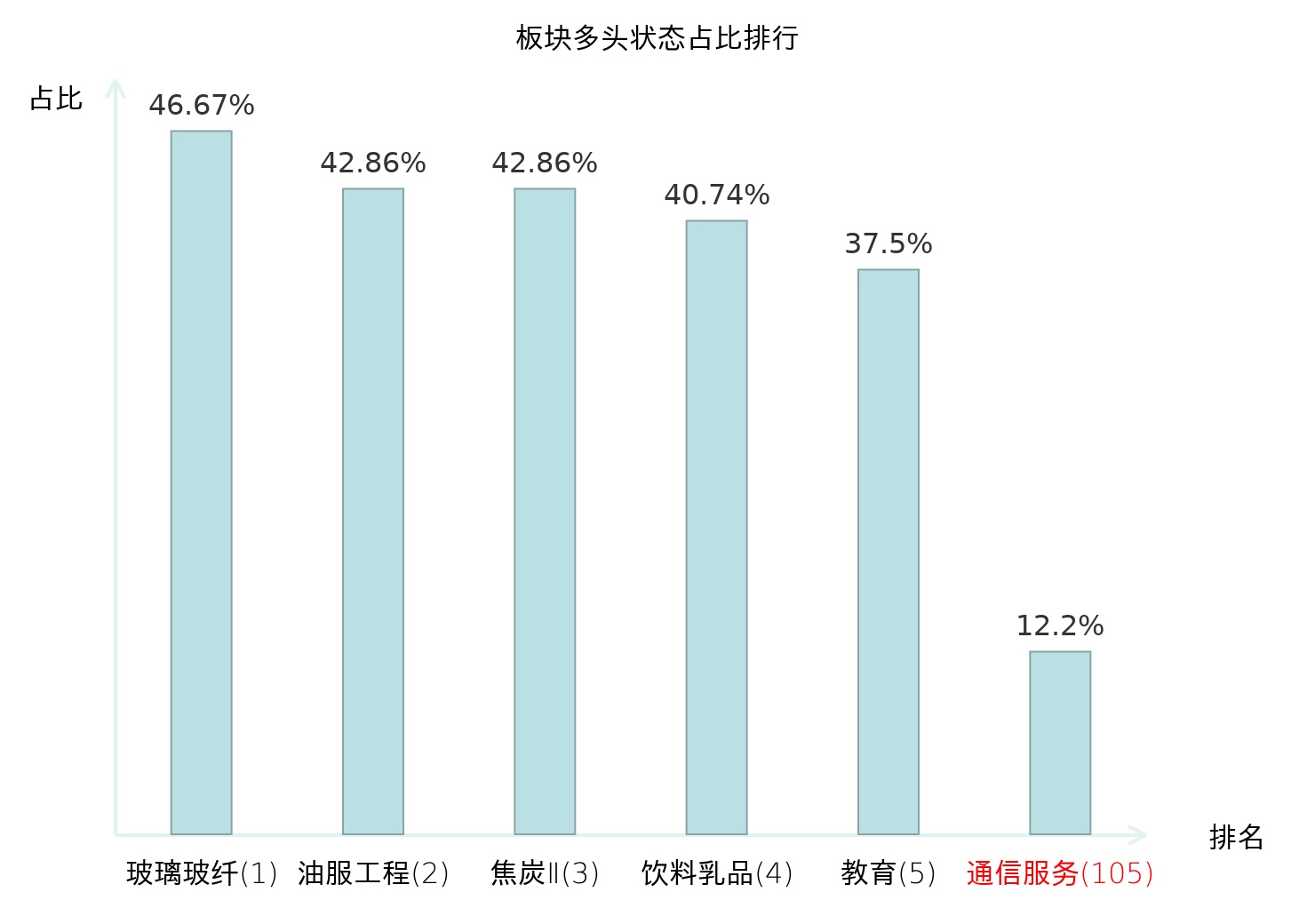 全市场所有行业板块中主力多头状态占比排名中,玻璃玻纤板块位居第一。航空机场板块名次提升最快,较昨日上升43位。