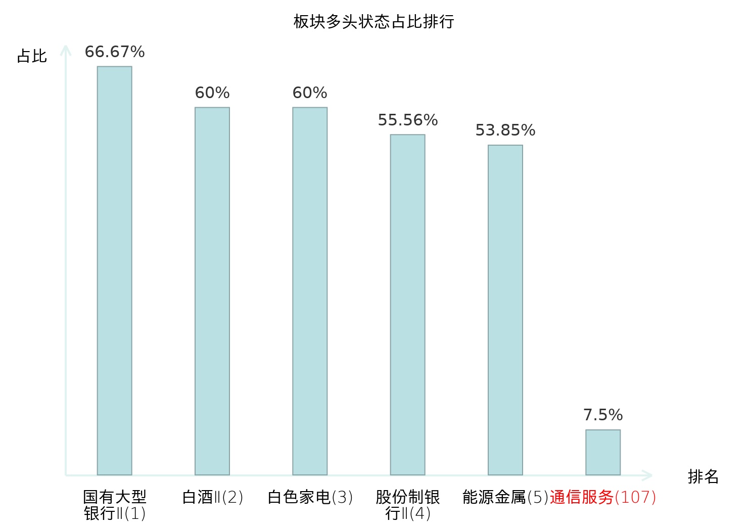 全市场所有行业板块中主力多头状态占比排名中,国有大型银行Ⅱ板块位居第一。电子化学品Ⅱ板块名次提升最快,较昨日上升55位。
