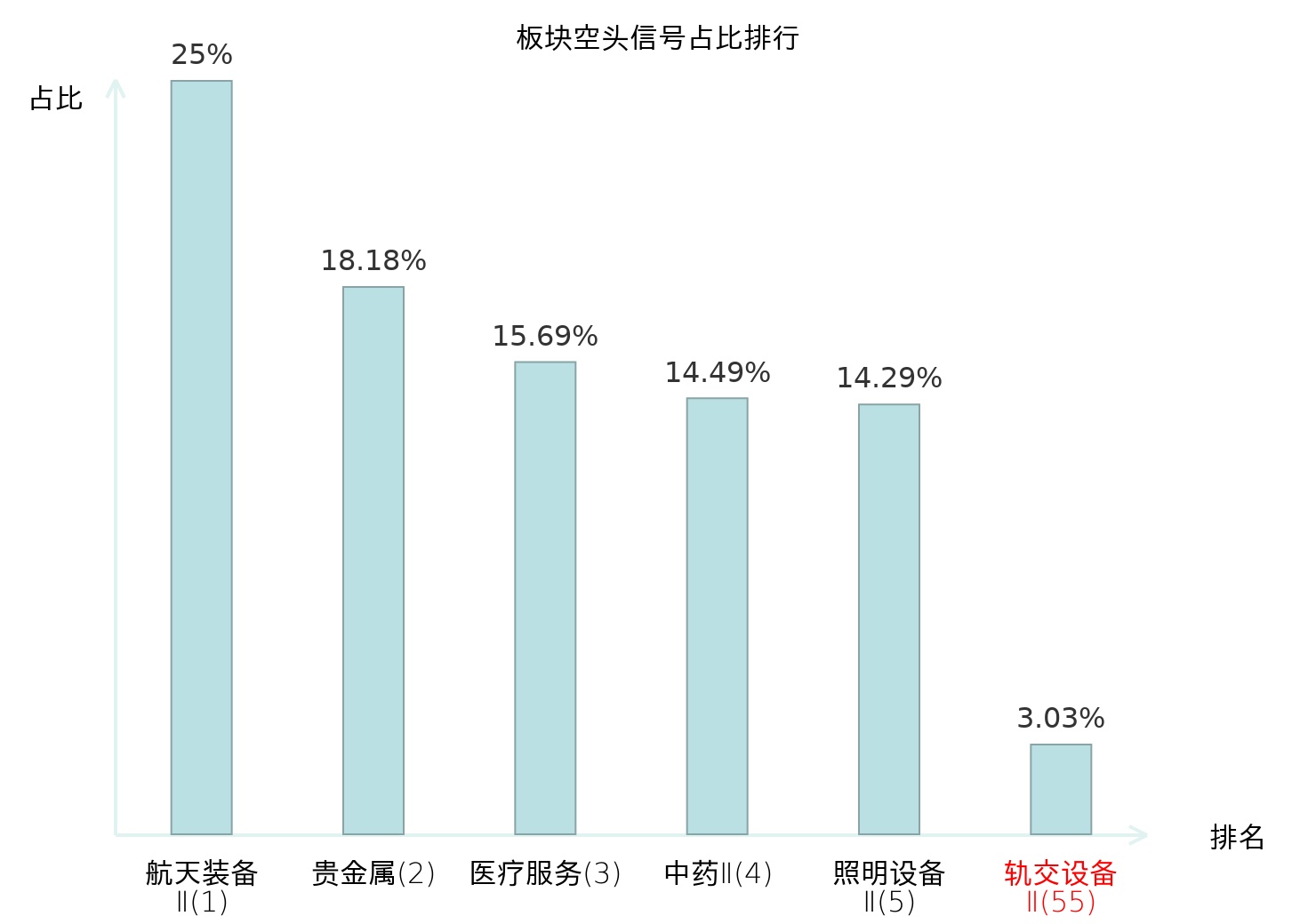 全市场所有行业板块中主力空头信号占比排名中,航天装备Ⅱ板块位居第一。物流板块名次提升最快,较昨日上升112位。