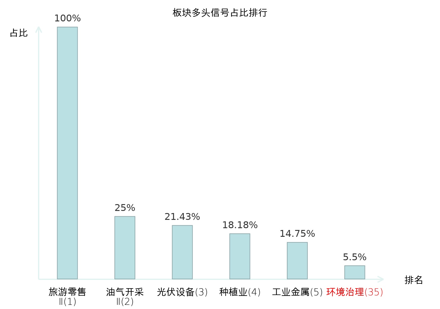 全市场所有行业板块中主力多头信号占比排名中,旅游零售Ⅱ板块位居第一。旅游零售Ⅱ板块名次提升最快,较昨日上升130位。