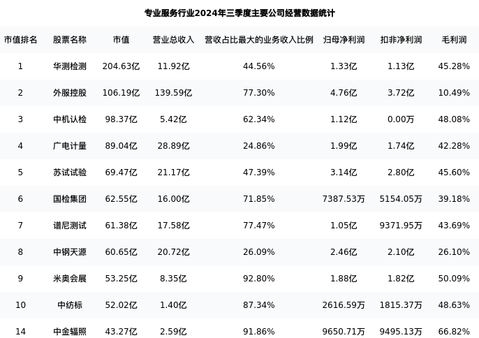 中金辐照最新报告期数据为三季度,下表汇总了专业服务行业内市值靠前的公司三季度主要经营数据