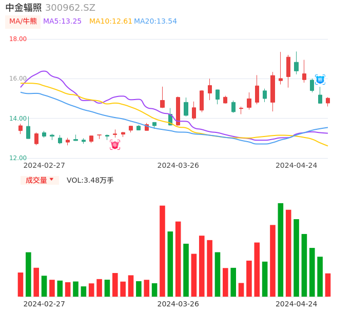 中金辐照近期出现日线级别熊点,且60分钟级别也处于熊点区间,股价处于偏弱行情,建议谨慎观望。