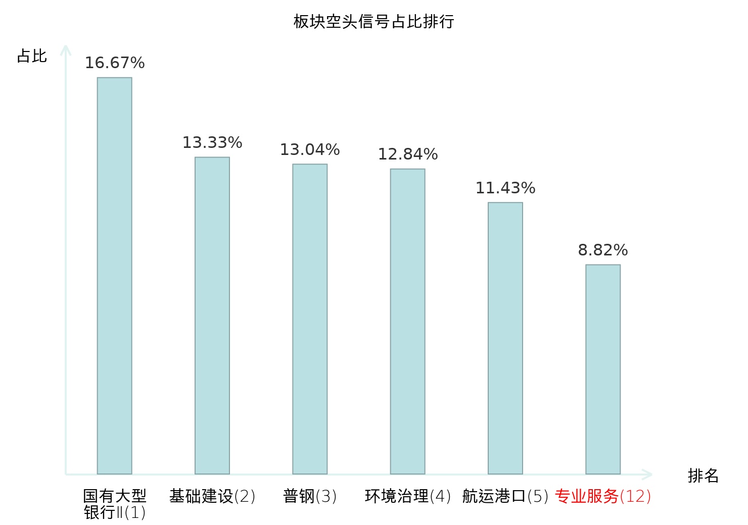 全市场所有行业板块中主力空头信号占比排名中,国有大型银行Ⅱ板块位居第一。环境治理板块名次提升最快,较昨日上升123位。