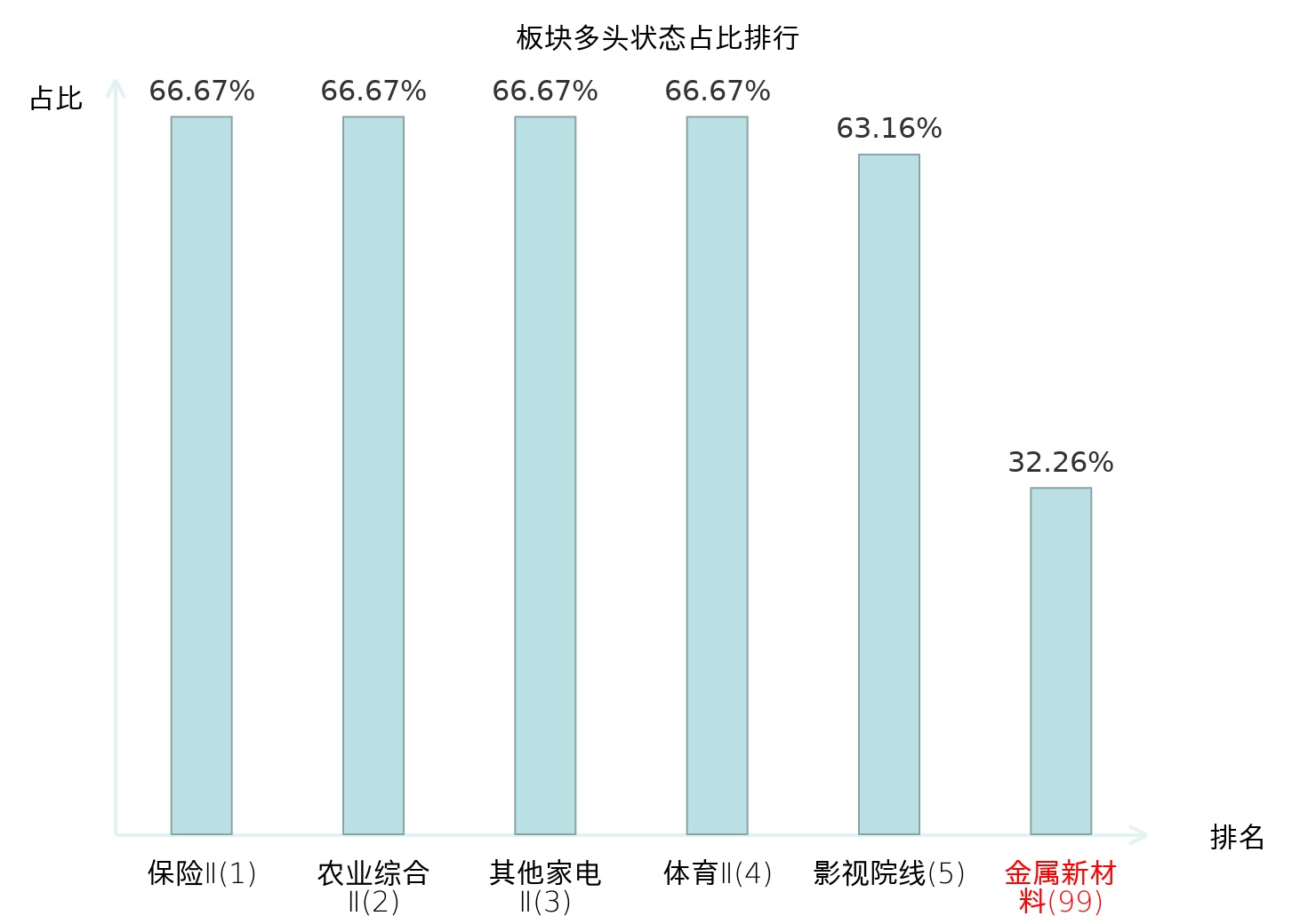 全市场所有行业板块中主力多头状态占比排名中,保险Ⅱ板块位居第一。冶钢原料板块名次提升最快,较昨日上升53位。
