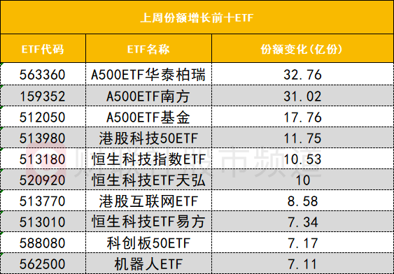 在上周份额增长前十ETF中,上周多只中证A500ETF份额大幅增加,其中A500ETF华泰柏瑞(563360)上周份额增长32.76亿份位居首位;A500ETF南方(159352)上周份额增长31.02亿份位居次席。