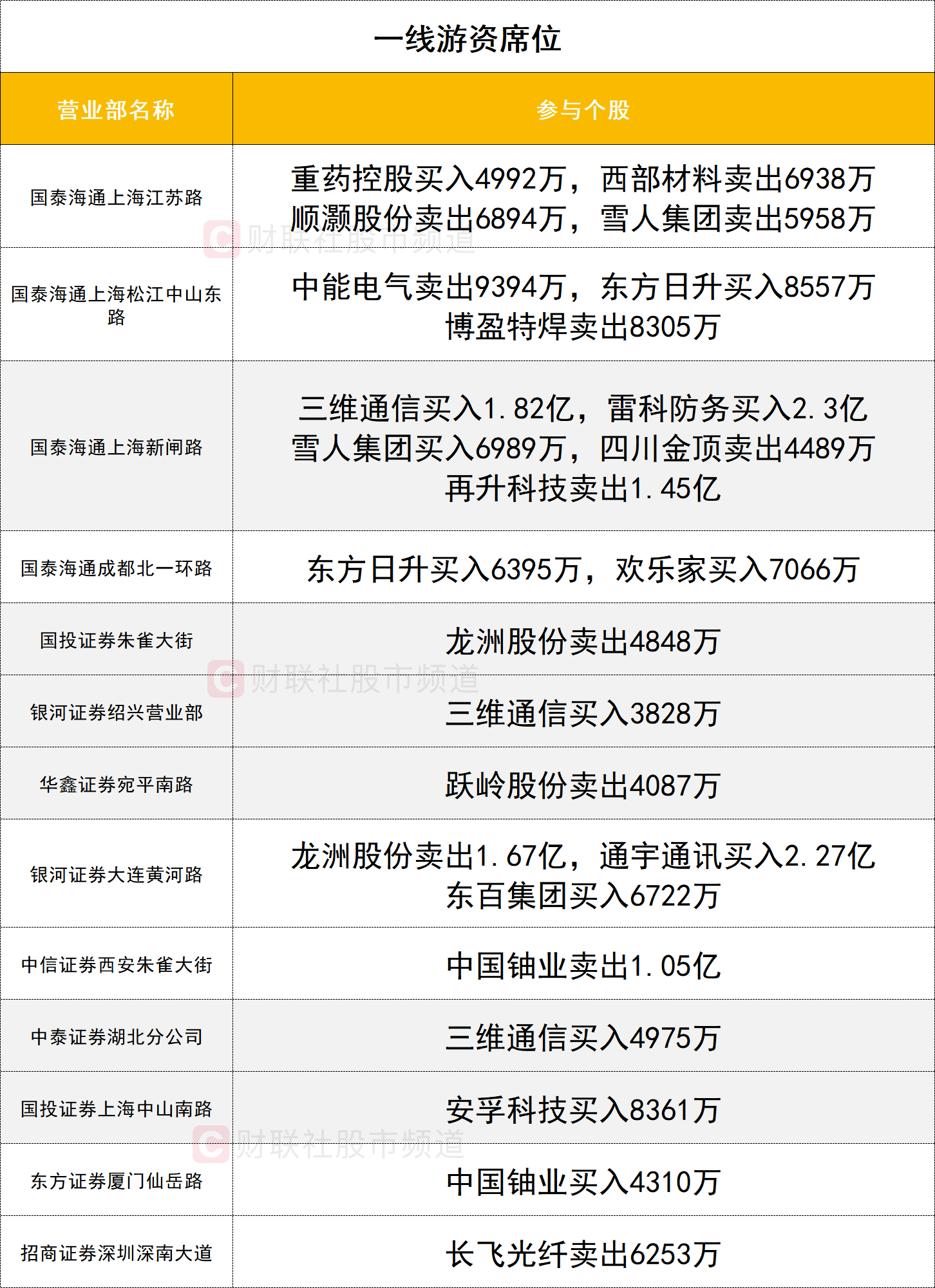 一线游资活跃度较高,雷科防务今日探底回升成功涨停,获一家实力游资(国泰海通证券上海新闸路)买入2.3亿。通宇通讯获中国银河证券大连黄河路席位大幅买入2.27亿。