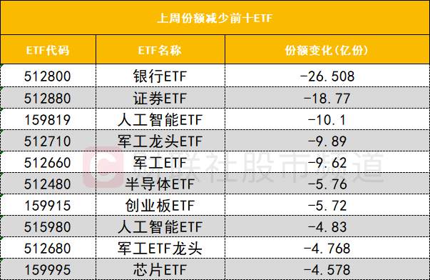 在上周份额减少前十的ETF中,银行ETF(512800)连续两周份额大减,上周减少26亿份,12月第一周份额减少19亿份,银行板块周线下跌1.69%。