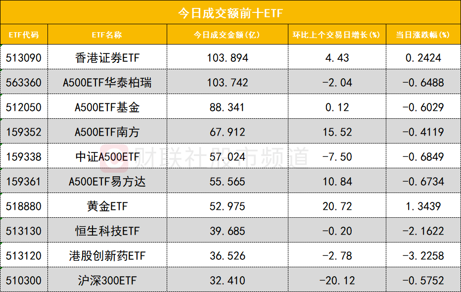 从成交额前十的ETF来看,香港证券ETF(513090)成交额位居首位,A500ETF华泰柏瑞(563360)成交额位居次席。