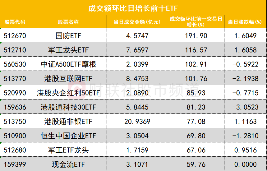 从成交额环比增长前十的ETF来看,国防ETF(512670)成交额环比增长191%位居首位;军工龙头ETF(512710)成交额环比增长116%位居次席。