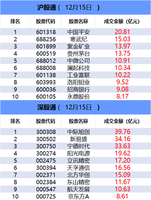 从沪股通前十大成交个股来看,中国平安位居首位;寒武纪和紫金矿业分居二、三位。