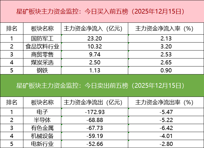 从主力板块资金监控数据来看,国防军工板块主力资金净流入居首。