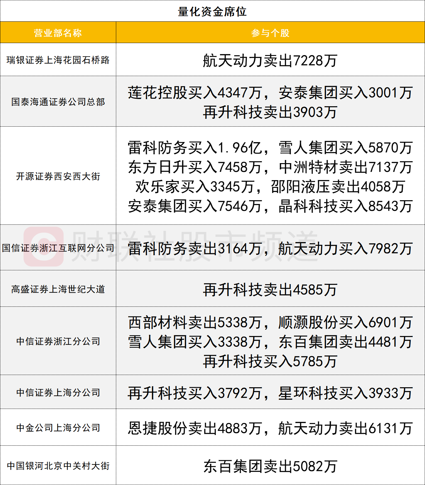 量化资金活跃度较高,雷科防务获一家量化席位(开源证券西安西大街)买入1.96亿。另一只商业航天概念股顺灏股份获中信证券浙江分公司席位买入6901万。