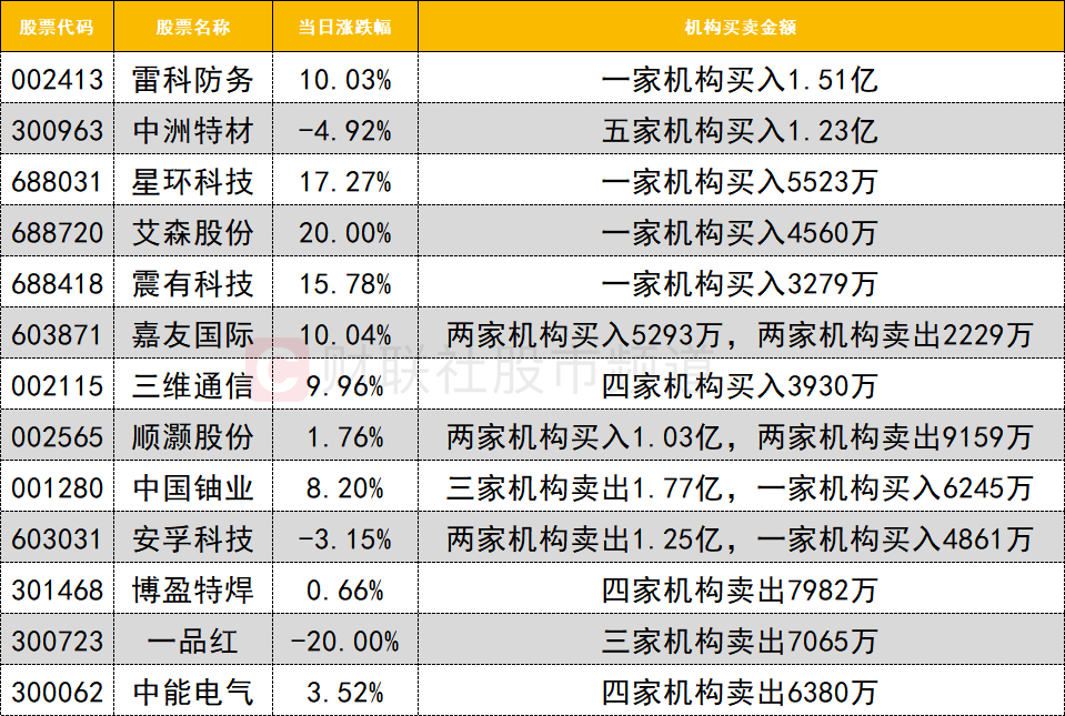 今日龙虎榜机构活跃度一般,买入方面,商业航天概念股雷科防务获一家机构买入1.51亿,同时深股通席位买入1.99亿。另一只商业航天概念股顺灏股份获两家机构买入1.03亿,同时遭两家机构卖出9159万。中洲特材获五家机构买入1.23亿。