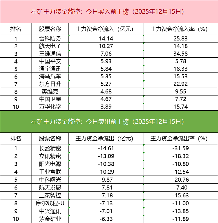 从个股主力资金监控数据来看,主力资金净流入前十的个股所属板块较为分散,雷科防务净流入居首。