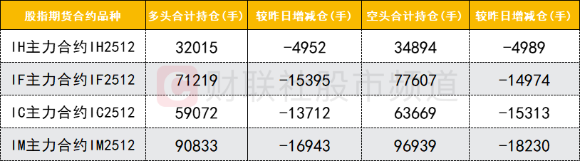 四大期指主力合约中,IH、IF、IC、IM合约多空双方均减仓,IC、IM合约空头减仓数量较多。
