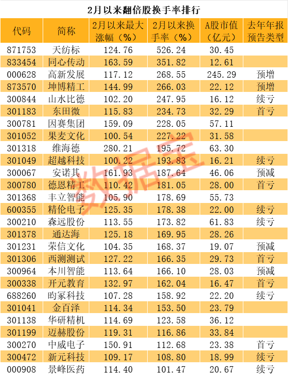 个股涨幅更大。统计显示,剔除次新股后,有53只个股2月以来最大涨幅超过100%,1300多只个股涨幅超过50%。梳理翻倍股发现,这类个股多为小盘科技题材,且普遍业绩较差、市盈率较高。