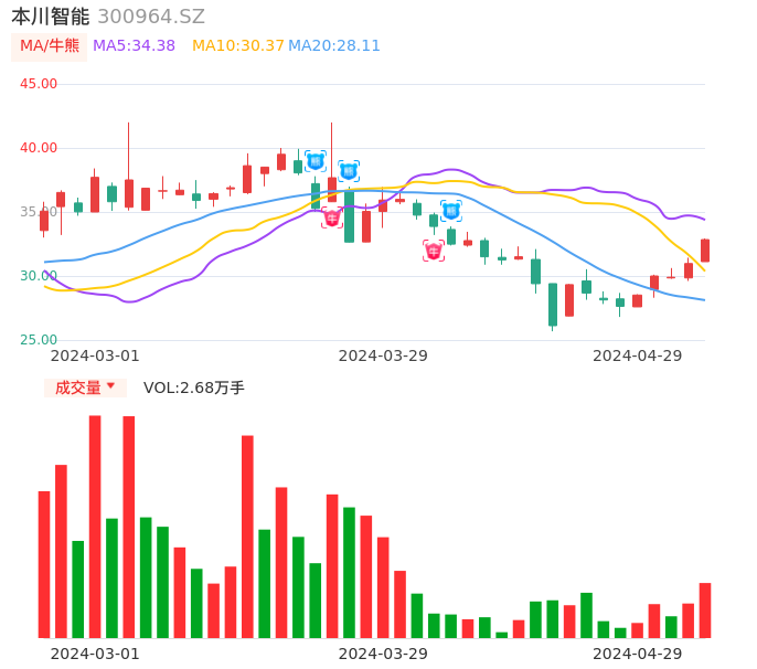 04月29日,本川智能收报32.84,股价涨幅6.04%,成交金额8698.48万元,换手率7.96%。