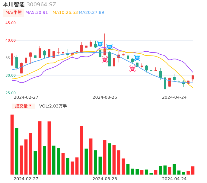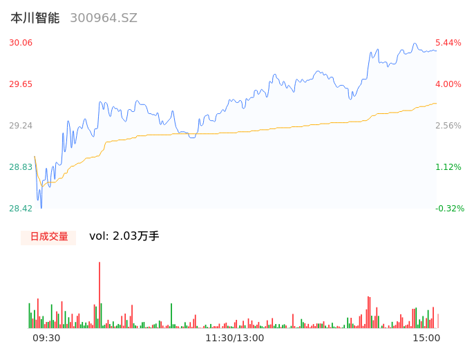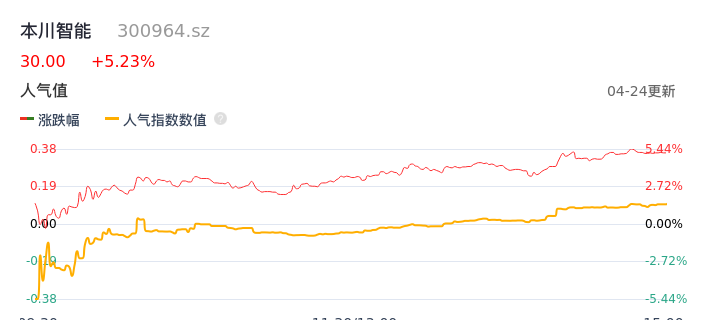 04月24日,本川智能收报30.00,股价涨幅5.23%,成交金额5995.49万元,换手率6.05%。