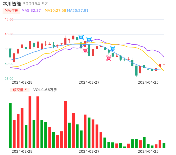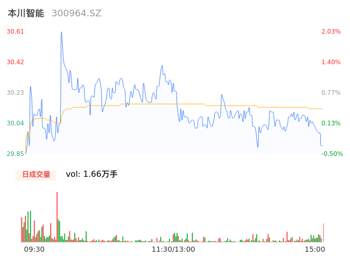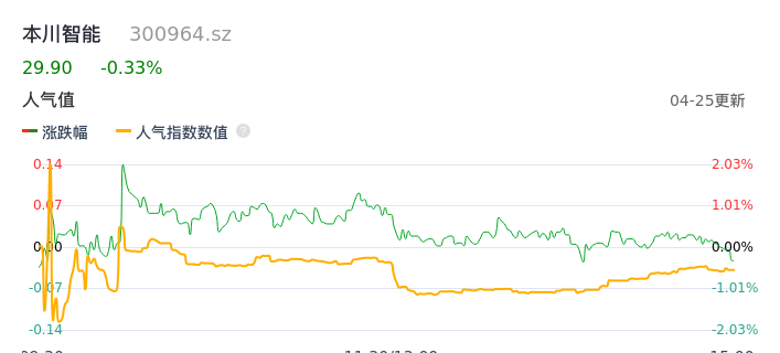 04月25日,本川智能收报29.90,股价涨幅-0.33%,成交金额5014.12万元,换手率4.95%。
