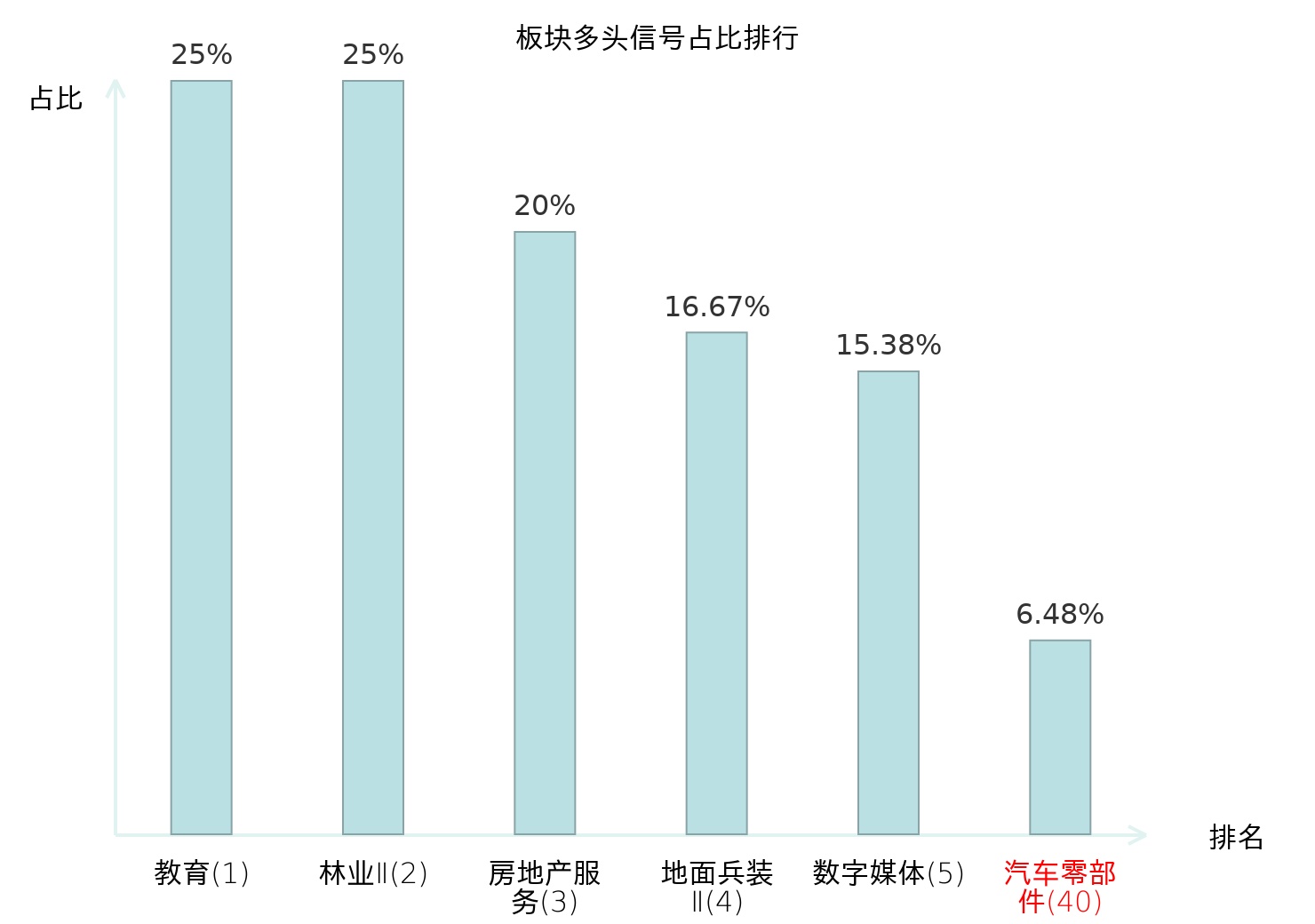 全市场所有行业板块中主力多头信号占比排名中,教育板块位居第一。林业Ⅱ板块名次提升最快,较昨日上升125位。