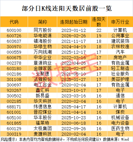 据数据宝统计,截至3月24日收盘,2020年以来,A股市场共有逾1400只股票日K线曾录得10天以上的连阳。4只股票日K线连阳天数在18天及以上,分别是同方股份、华电能源、镇海股份、华绿生物。同方股份曾于2023年1月12日起至2023年2月17日期间录得22连阳,排在首位。
