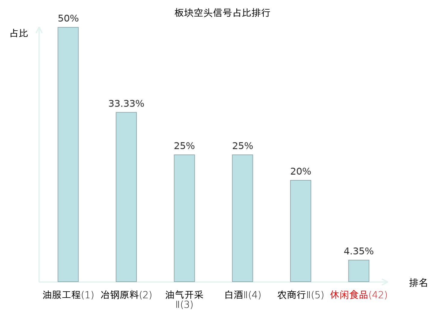 全市场所有行业板块中主力空头信号占比排名中,油服工程板块位居第一。白酒Ⅱ板块名次提升最快,较昨日上升110位。