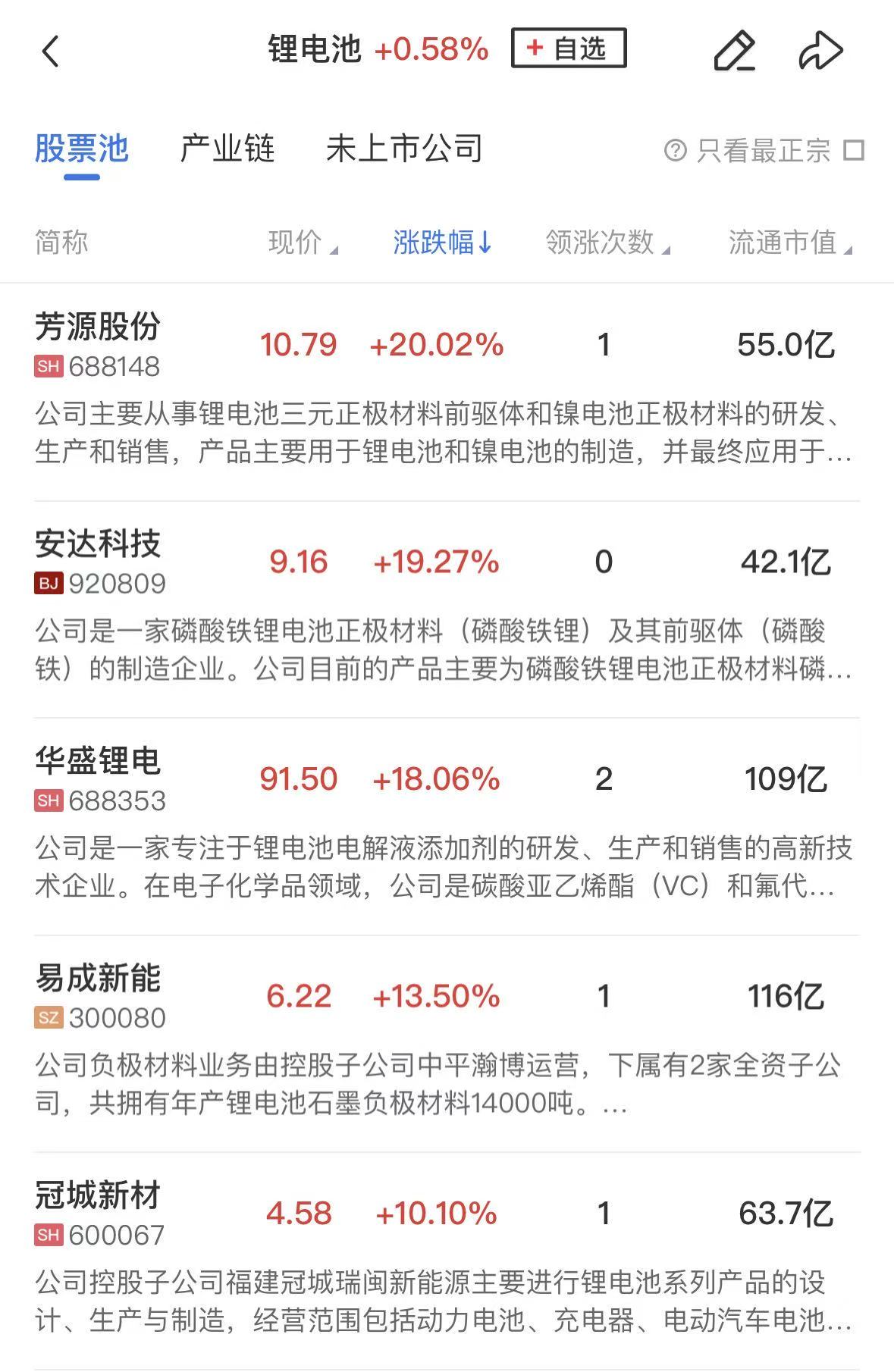 锂电板块开盘再度冲高,天际股份、芳源股份、滨海能源涨停,华盛锂电、恩捷股份、石大胜华等个股涨幅居前。