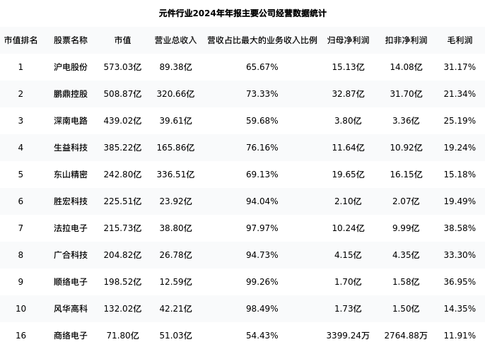 商络电子最新报告期数据为年报,下表汇总了元件行业内市值靠前的公司年报主要经营数据
