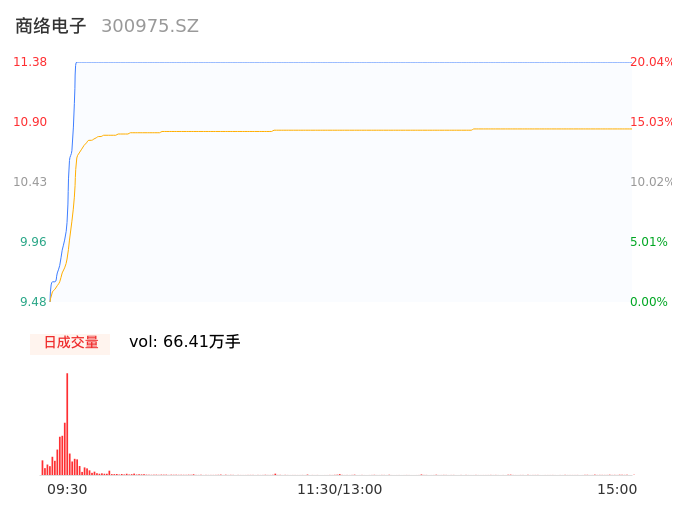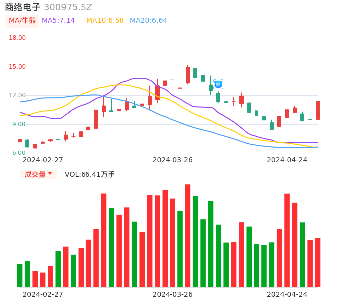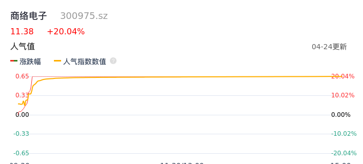 04月24日,商络电子收报11.38,股价涨幅20.04%,成交金额7.21亿元,换手率14.67%。
