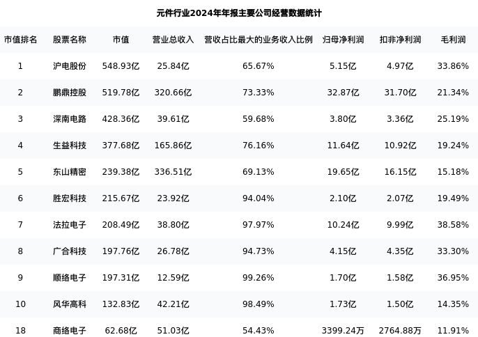 商络电子最新报告期数据为年报,下表汇总了元件行业内市值靠前的公司年报主要经营数据