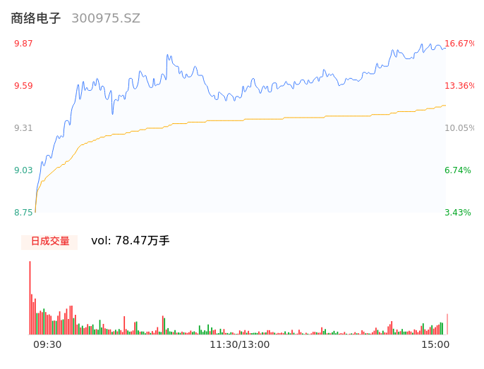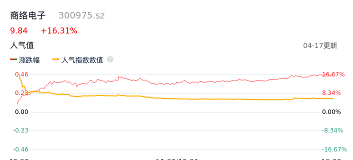 04月17日,商络电子收报9.84,股价涨幅16.31%,成交金额7.42亿元,换手率21.79%。