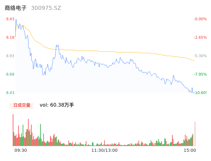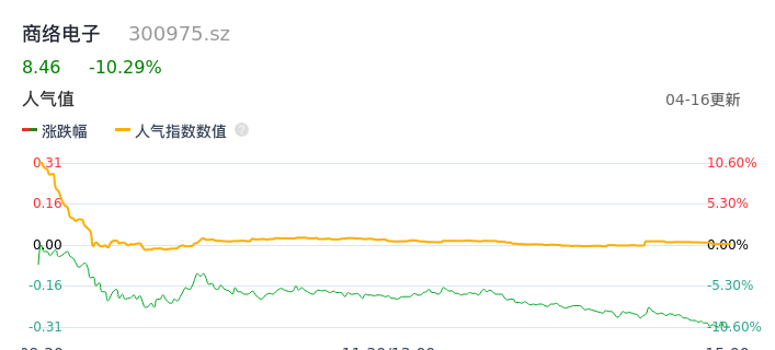 04月16日,商络电子收报8.46,股价涨幅-10.29%,成交金额5.35亿元,换手率16.76%。