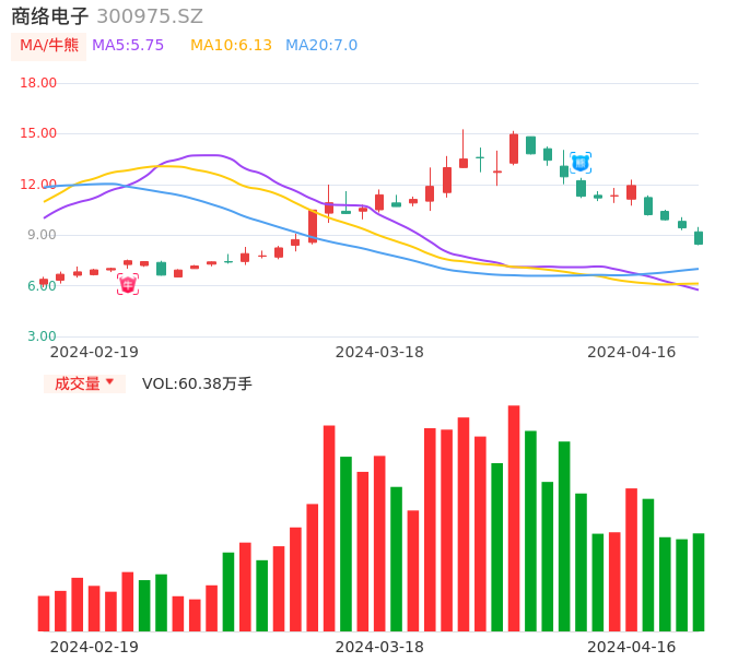 商络电子在4月3日出现日线级别熊点,从熊点信号发出到今日8日内累积跌幅已经达到25.13%,股价近期跌幅巨大,KD指标数值为:14.08,已经出现超卖信号,短期套牢盘严重,如后期60分钟周期由熊转牛且基本面/消息面未发生重大变化则可能弱势反弹。