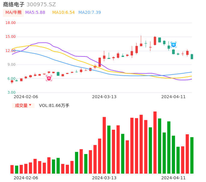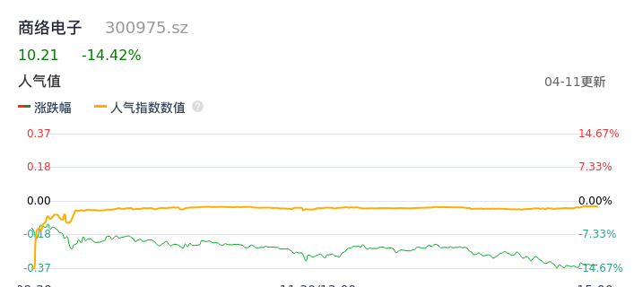 04月11日,商络电子收报10.21,股价涨幅-14.42%,成交金额8.76亿元,换手率22.67%。
