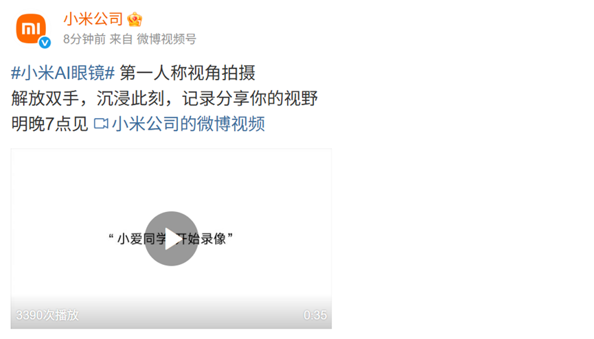 从小米最新发布的视频来看,这款AI眼镜最大的卖点之一即为拍摄功能,用户可呼唤小爱同学,开启第一人称视角拍摄录像。